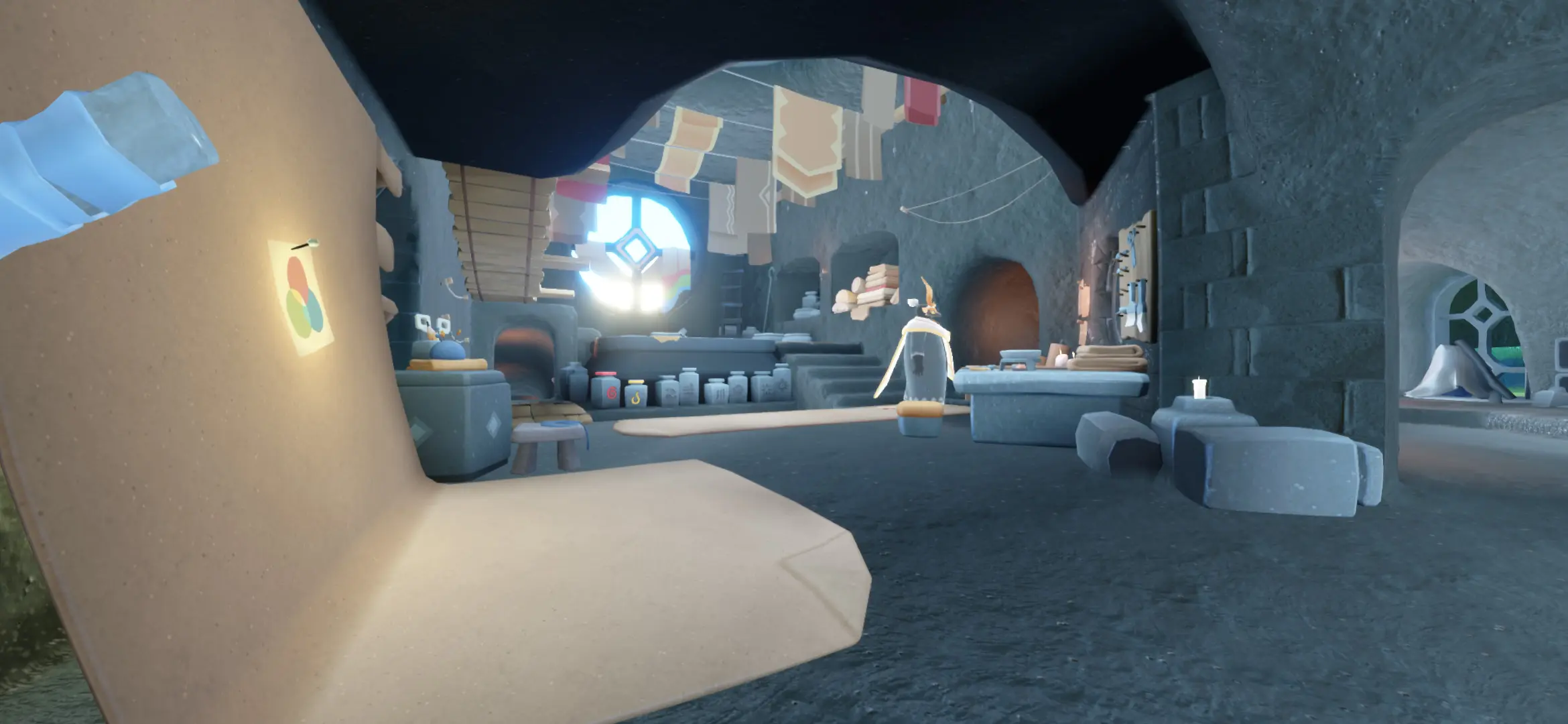 光之染坊地下室只做為劇情使用,目前並沒有其他功能,只有一個留言祭壇以及一個可以編輯共享空間的位置設施。