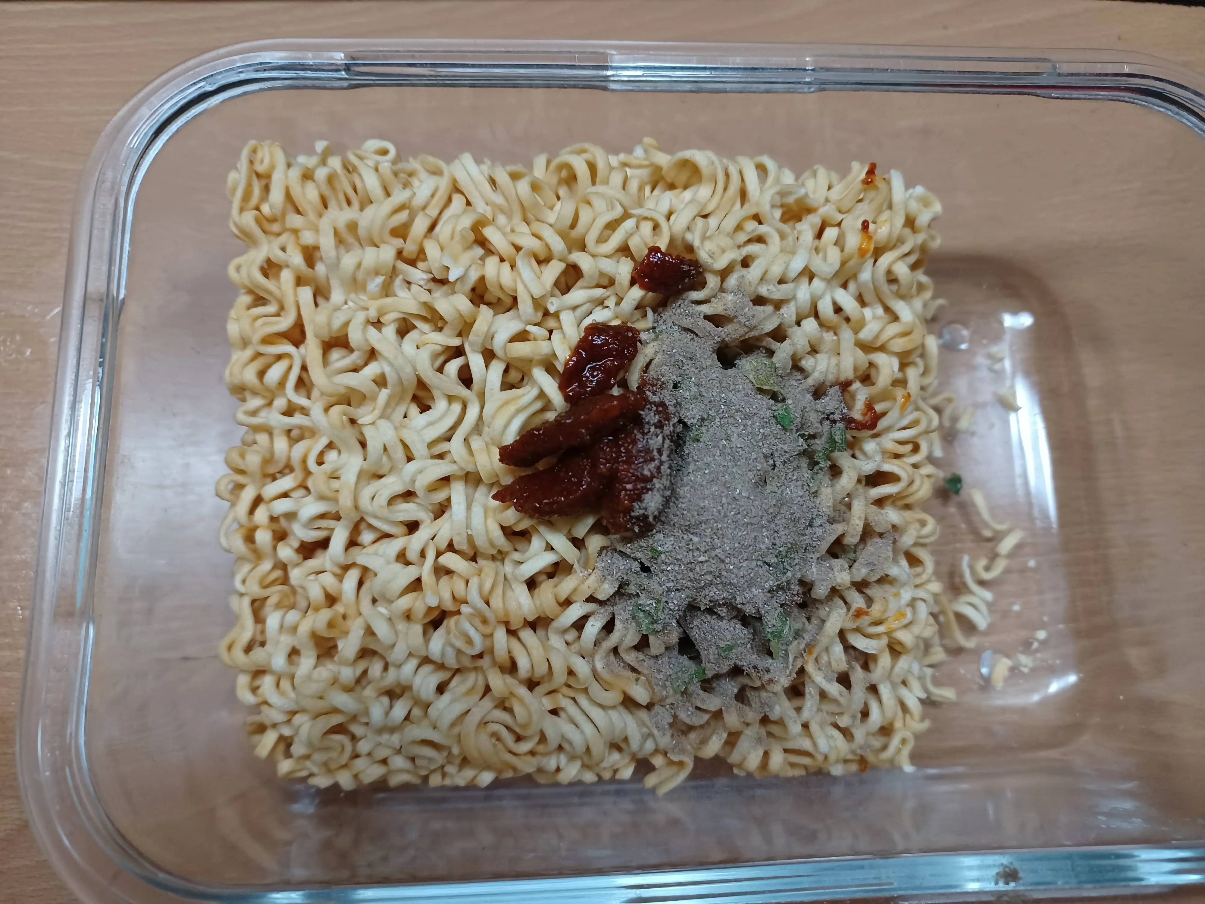 下面是麵體,麵體偏小塊,油包的量也是小小的。