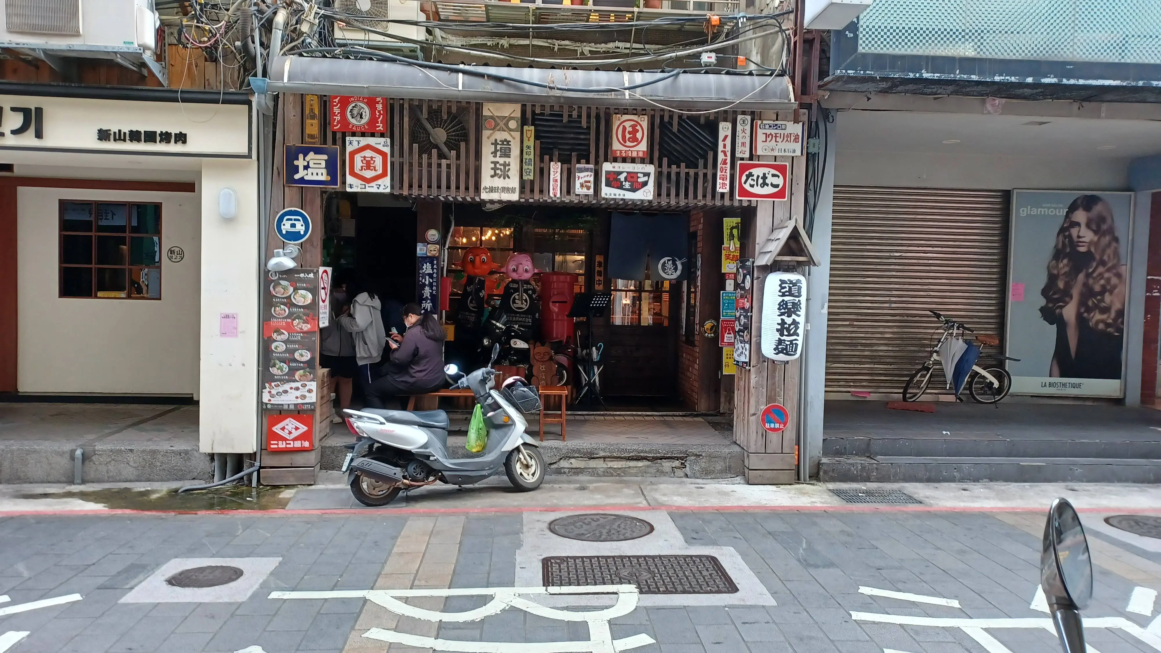 跟著孤狗小姐的指示漫步到了拉麵店前面,剛開始還好,沒有仔細看招牌,而是在確認是不是這家店,看到放在外面我就放心了。默默的退到店家外面準備為門面拍一張代表著噹噹到此一遊的照片,不看還好一看哇勒…老闆是把招牌當成貼紙簿在貼嗎?一張上面寫著撞球一個寫著學生服,完全不搭嘎的符號就這樣組合成了門面,反而道樂拉麵卻自己默默的待在角落。好…好有日本味?