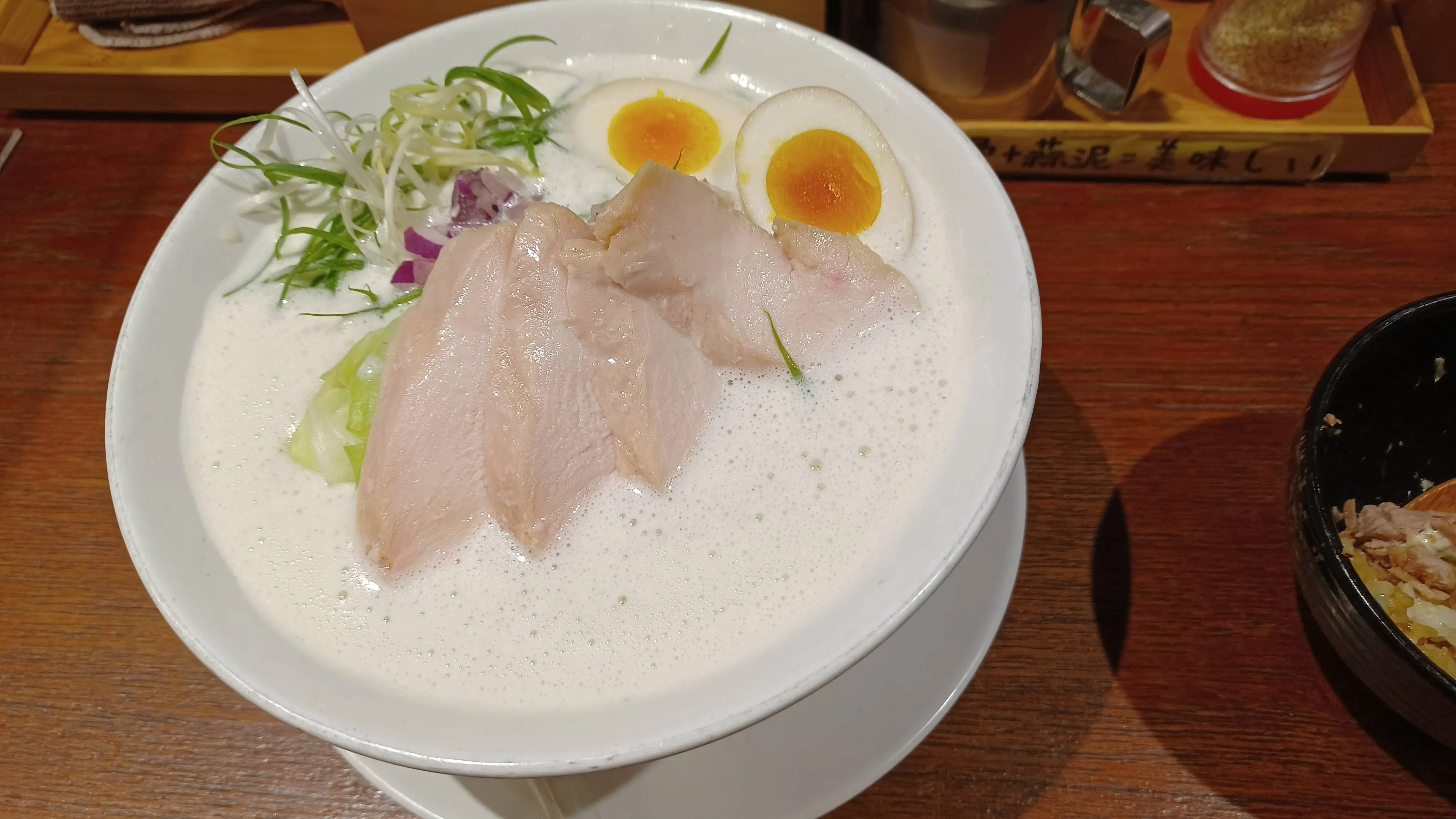 點了一碗叉燒飯還有雞白湯拉麵,我是13:24拿到叉燒飯然後13:29拿到拉麵的,製作時間不會非常久。先來說說雞白湯吧!剛開始送上來的時候長這個樣子,滿滿的白色湯完美的跟碗融合成一體,就像是碗裡面有無盡的湯不斷的傾瀉而出一樣。湯頭很像是傳統的雞白湯但是!卻加了奶香味,還記得你在夜市吃到的那種牛奶鍋嗎?把那個的奶香增加10倍後注入雞白湯裡面就是這種味道,雖然濃郁卻又能夠不遮掩雞的光彩,就像是在台上的兩個主角手勾著手跳著他們最拿手的華爾茲。