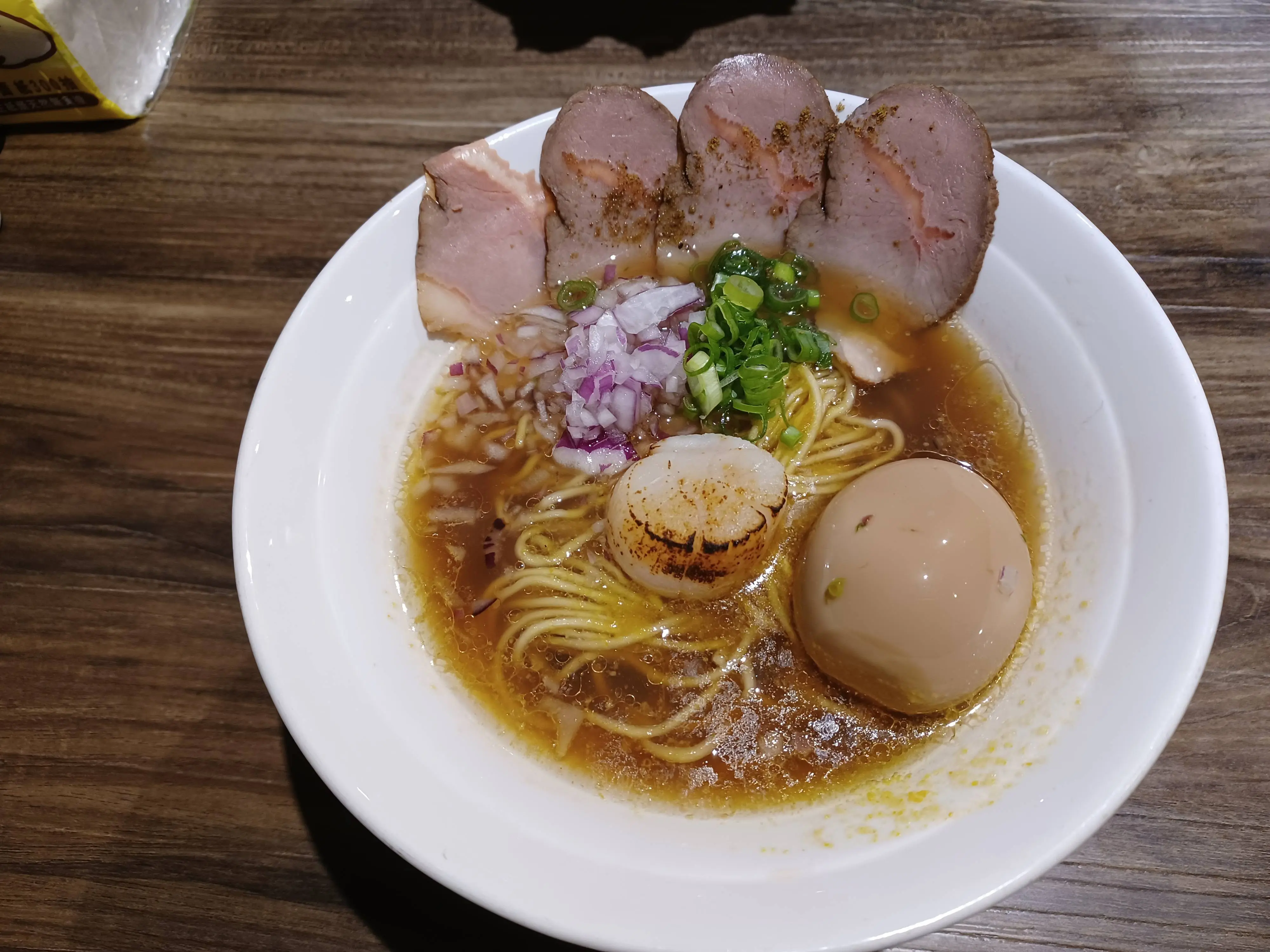 我點的是柚香貝出汁拉麵加一顆溏心蛋,讓我先來看看他的湯頭哈,喝起來有點像是10倍濃的蛤蜊湯滿滿的鮮甜味是他的特色,豚骨十分軟嫩卻吃的到他的豬味。不過我已經分不太清楚到底應該是要稱讚店家功夫了得還是節省成本了,叉燒薄到我甚至覺得把它拿到燈光下光線是能透過去的。