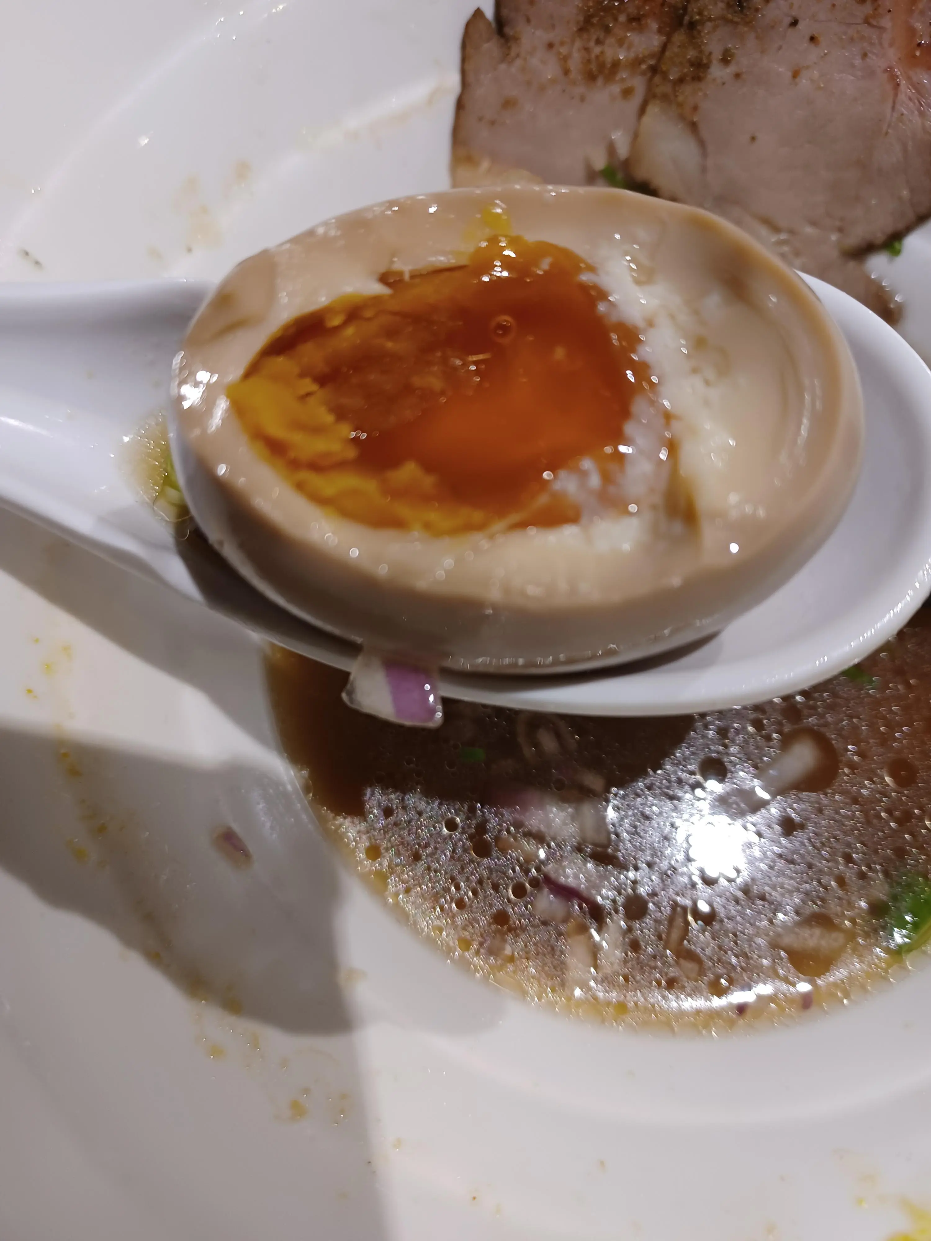 他的溏心蛋我也覺得很特別!第一次吃到這種蛋,明明外表是一顆全熟的蛋,但是咬下去之後才發現不是一般的軟,甚至入口即化。蛋黃是有一點點甜味的,增添了一點層次。