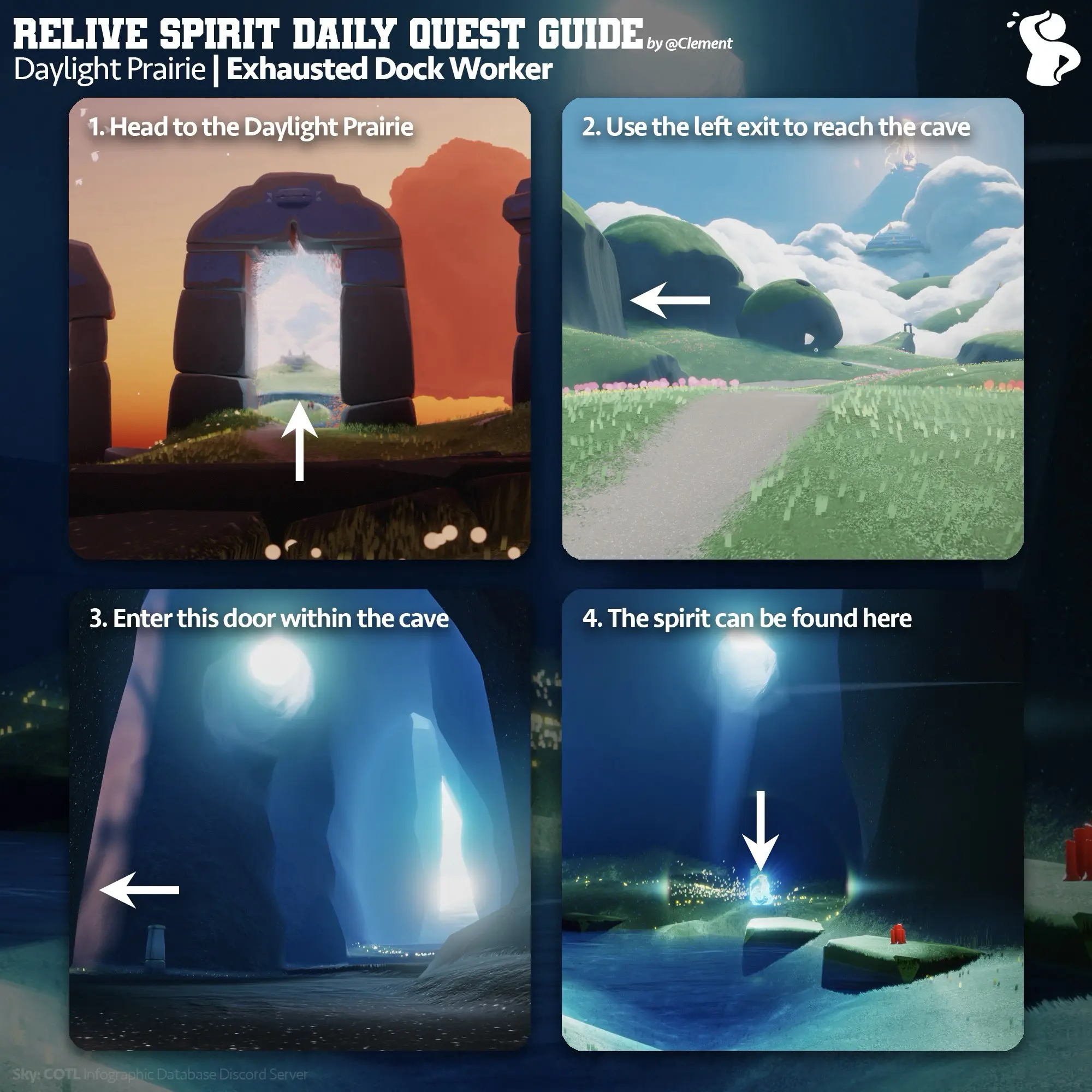 要完成在雲野重溫辛勞碼頭工的記憶,玩家需前往『雲野』(Daylight Prairie)地圖,找到先祖靈魂『辛勞碼頭工』(Exhausted Dock Worker),重溫其記憶即可完成任務。